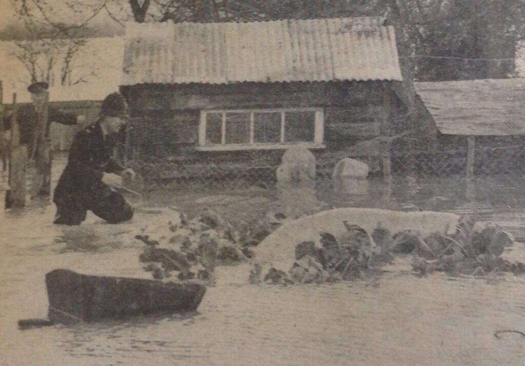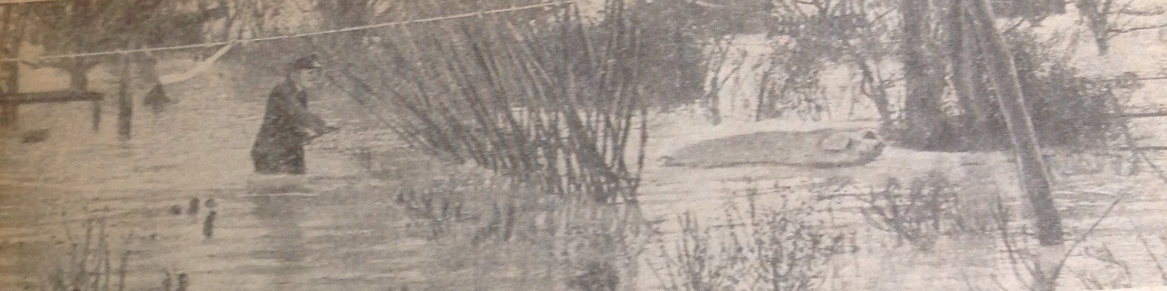 There was of course a gritty and serious side to Derek’s work, but in other aspects, there was often a quiet humour that underpinned a lot of his news reportage. It remains a delight. He told one of his prot’eg’es never to go out hunting for a scoop. Instead, allow the scoop to come to you. I was thinking about this when I came across these photos from his exhaustive albums full of cuttings. As much as the hop season comes around year after year, the return of flooding was almost another certainty. Another hardy annual. I know from my years of working on local papers, flooding always meant lots of opportunities to fill newspapewr space. And so it must have been when Derek arrived in Willersley in 1960 to take routine pictures of the River Wye breaking its banks and flooding the village. But then Lulu the pig changed everything. The much-loved family sow went walkabout/swimabout in the floods and two stalwarts, one a police constable and the other an officer from the RSPCA, wade into the cabbage patch, where Lulu finds her swimming trotters and swims away, oblivious to the drama that surrounds her.