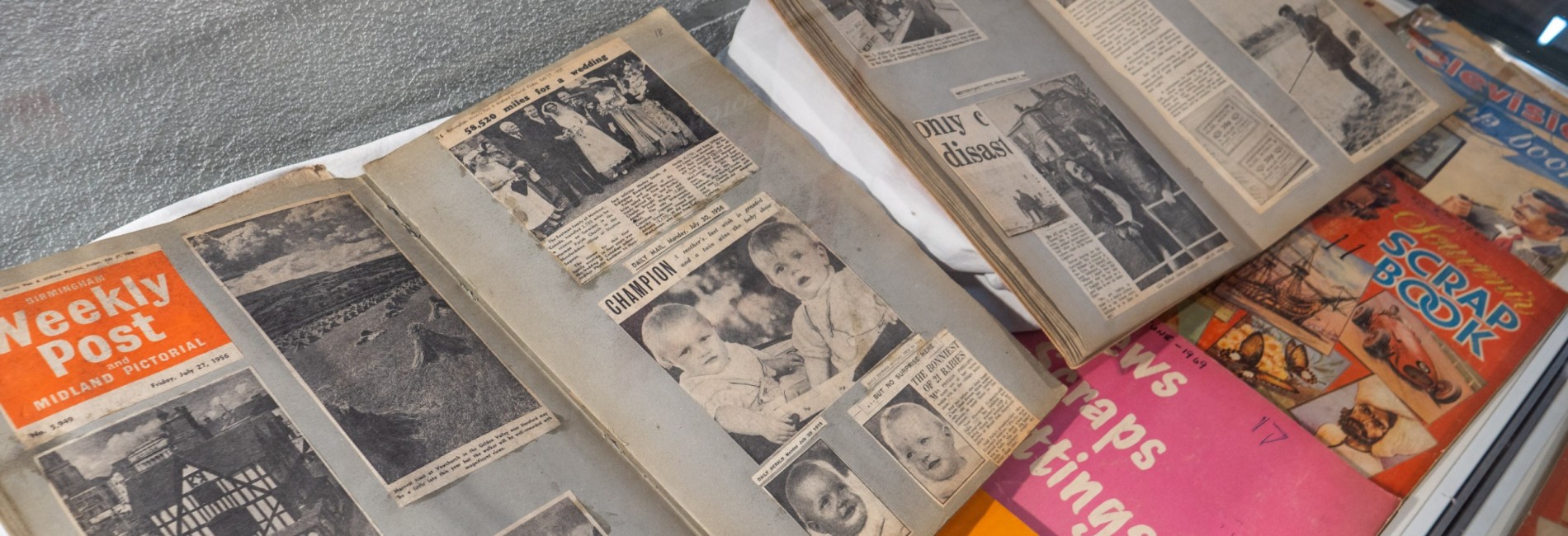 Original scrapbooks and 16mm film gear alongside tablets displaying interpretation