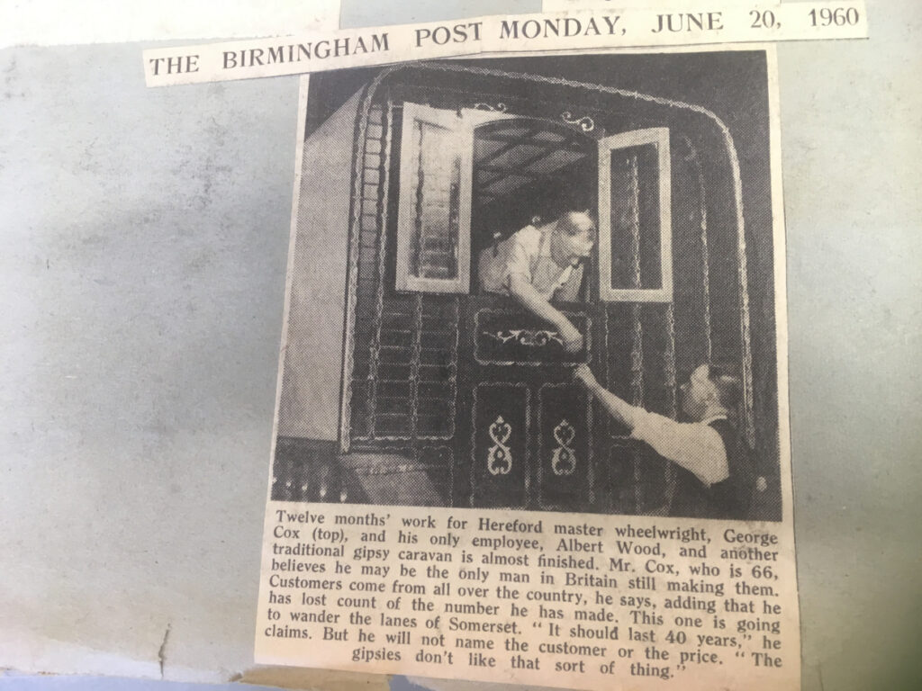 He was on hand, in 1960, at Hereford train station, to witness the safe delivery of an exquisite, hand-crafted gypsy caravan, a vardo. The maker’s name, George Cox, is now all but lost in the mists of time. But, thanks to these dusty, scruffy scrapbooks, we can salvage the name of this humble wheelwright. His work, however, is still remembered. A quick Google search leads to www.gypsywaggons.co.uk. Here, the richness of George’s work can been. It seems he has quite a name when it comes to the Vardo.